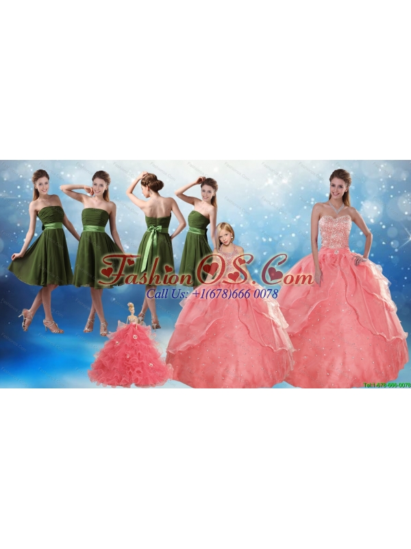 Home >  Quinceanera Dresses >  Quinceaneara Package > Beading Sweetheart 2015 Watermelon Quinceanera Dress and Strapless Knee Length Prom Dresses and Watermelon Halter Top Little Girl Dress
