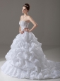 Are you looking for a high quality and resonable wedding dress? This one is surely your best choice. It features a sweetheart neckline on the beaded bodice. What draws more attention is its picked up skirt, so stunning and fabulous. A lace up corset style closure in the back secures the dress in place and the back of the dress extends to a court train.