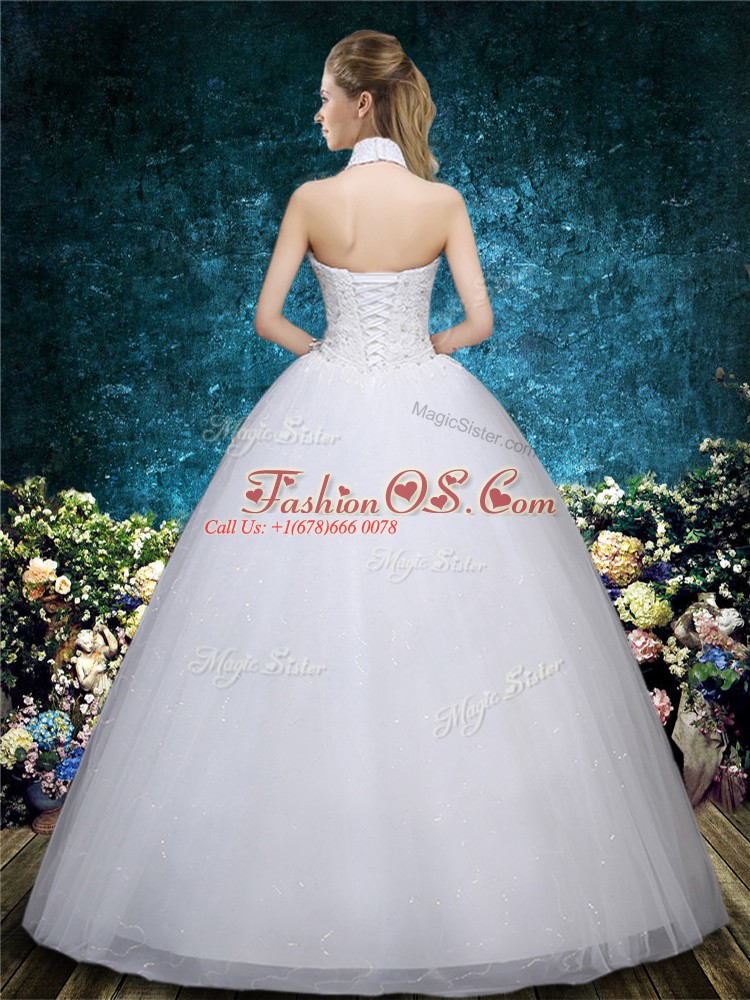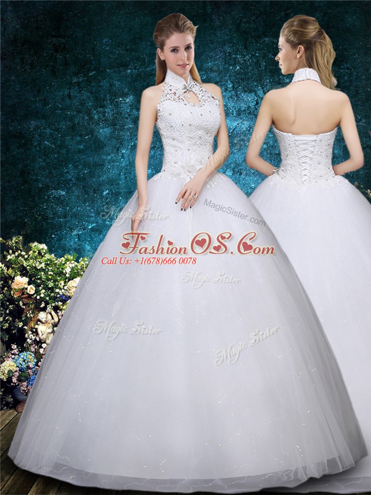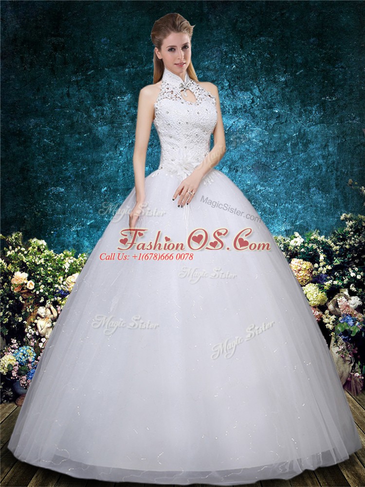Beauteous Ball Gowns Bridal Gown White High-neck Tulle Sleeveless Floor Length Lace Up