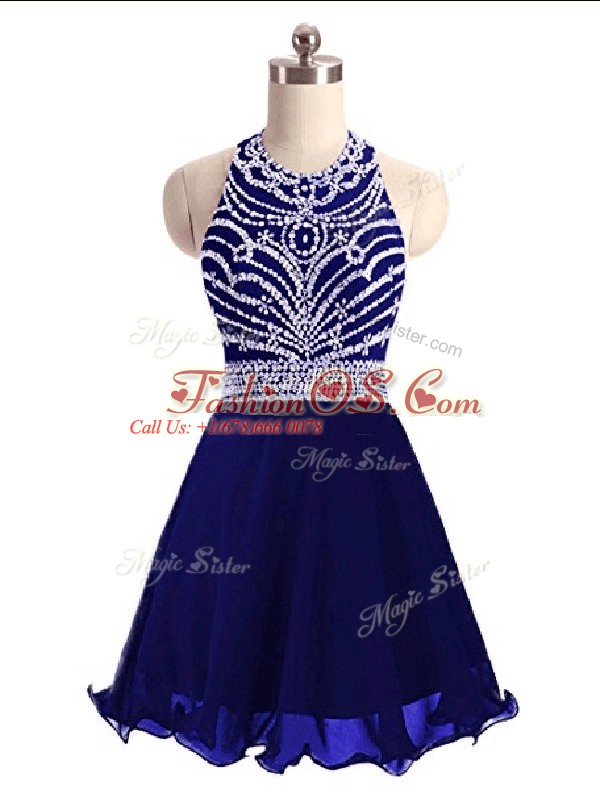 Beauteous Blue Chiffon Lace Up Dress Like A Star Sleeveless Mini Length Beading