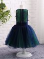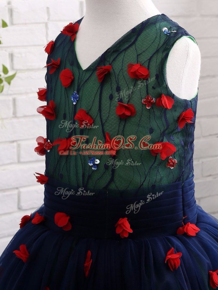 Home >  Special Occasion Dresses >  Mini Quinceanera Dresses > Beauteous Navy Blue Tulle Zipper Kids Formal Wear Sleeveless Knee Length Lace and Appliques