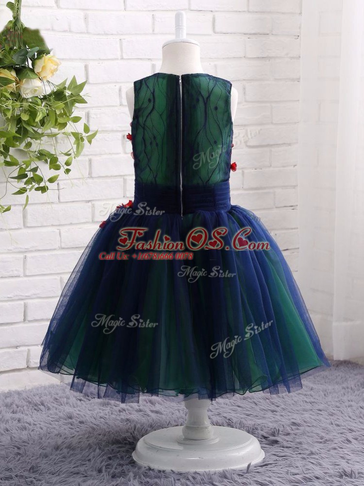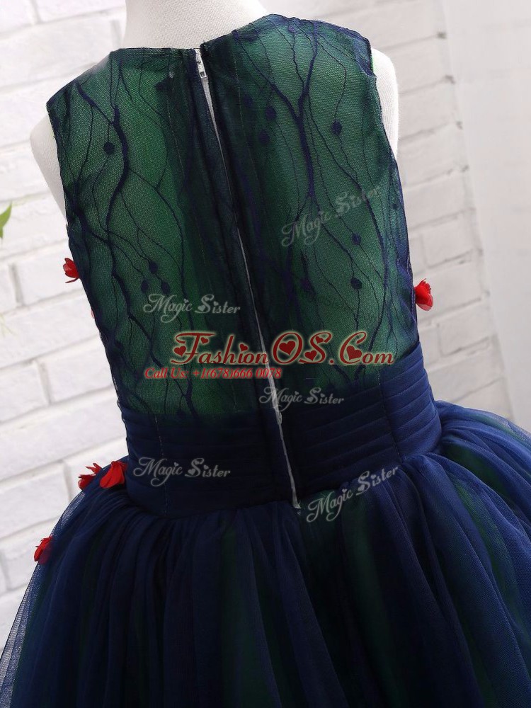 Beauteous Navy Blue Tulle Zipper Kids Formal Wear Sleeveless Knee Length Lace and Appliques