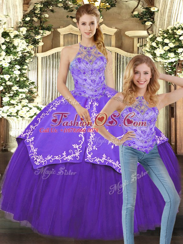 Beauteous Purple Sleeveless Satin and Tulle Lace Up Quinceanera Gown for Military Ball and Sweet 16 and Quinceanera