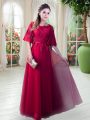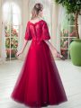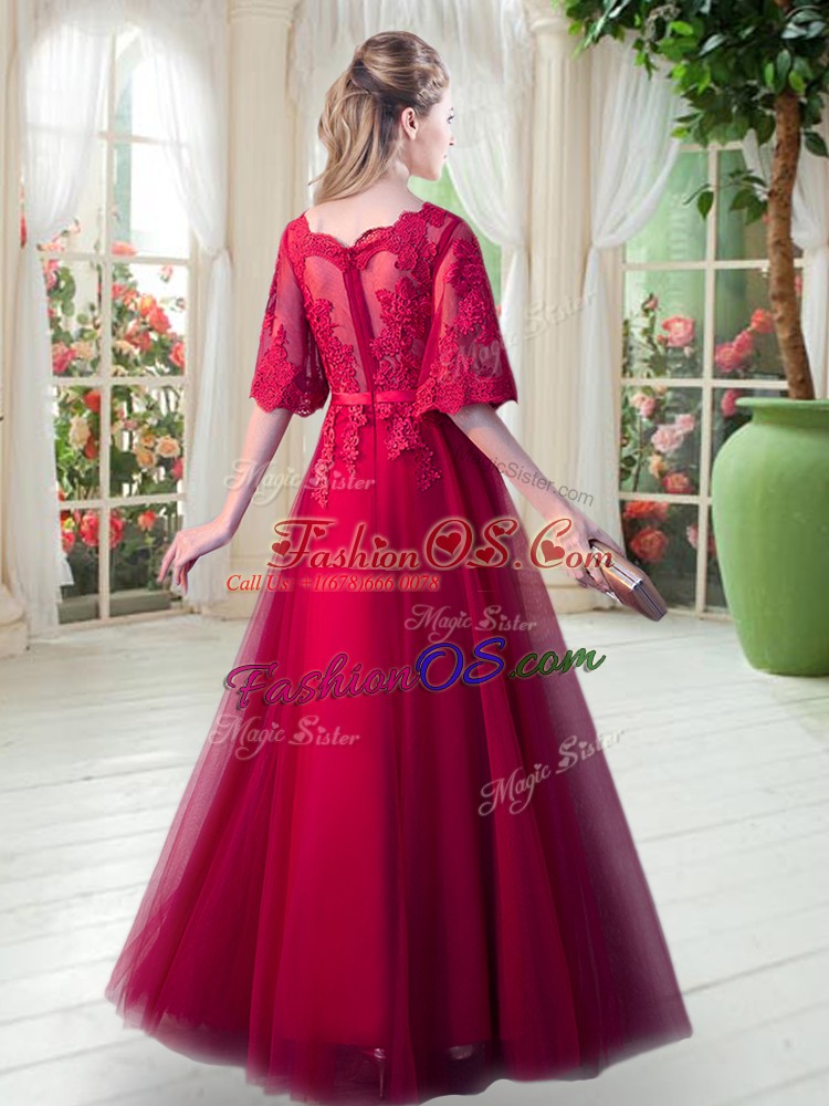 Beauteous Red A-line Tulle Scoop Half Sleeves Appliques Floor Length Zipper Prom Party Dress