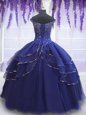 Beauteous Royal Blue Ball Gowns Organza Off The Shoulder Sleeveless Beading and Ruffled Layers and Sequins Floor Length Lace Up Quinceanera Dresses