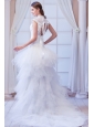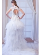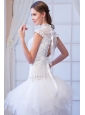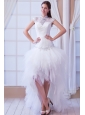 Every bride wants a perfect wedding. The wedding dress is the key of that. The high neck collar with lace pattern and heavy crystals is the perfect combination of tradition and chic. The lace jacket over the sweetheart lining gets a feeling of romance. The high-low skirt on front full of organza ruffles continues to create a train that takes on forever beauty and elegance. The crystaled cut out on center of the back and the bowknots are the lightspot which will add interest to the already dramatic dress. What are you waiting for?