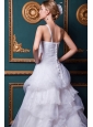 Strapless dresses are one of the sexier styles on the market today. They show just enough skin to be classy without being too revealing. This one features a lovely beaded one shoulder style and the ruching bustline. The amazing A-line skirt is reminiscent of the old fashioned hoop skirts and is made from several layers of pieced fabric that adds another dimension of beauty to an already lovely gown. The dress sways beautifully across the floor when you move, as if you're floating on air. A lace up corset style closure in the back secures the dress in place.