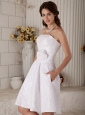 If you're looking to make a lasting impression at your upcoming formal event, this stunning white dress can make sure that you do. A fitted,strapless bodice is highlighted with the empire style. The floral embellishment adds the charm of the short dress and decorate the curve. A hidden zipper up style closure in the back secures the dress in place. An absolutely perfect gown when looking your best is a must.