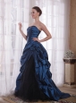 This dress is so gorgeous, it would even make Cinderella jealous!The structured bodice is made of the ruched fabric and the trim of the corset style closure in the back. The long skirt features a ruffled taffeta overlay attached a train incorporated the traditional train feature but not to be troubled by a long train and a net underlay. The back features a corset-style closure that ensures a perfect fit. You will absolutely love this special dress!