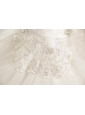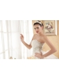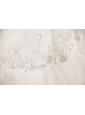 This unparalleled white wedding dress definitely captures your eyes! The structured bodice is overflowed with shinning beading formed a refined vase and a modest sweetheart. The A-line skirt with a chapel train is overlayed with sheer tulle that adds to its overal fullness and the underskirt made of exquisite lace embellished with appliques. The back features the trim of the corset style closure. Such a gorgeous creation, why not capture it?