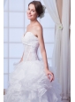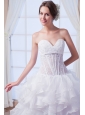 This eye-catching white wedding dress is sure to light up your pleasure. The modified sweetheart and boning details overflowing with shining beading showcases your flawless and perfect curves. The A-line skirt is made of Layers of organza that makes you feel you are fairy dancing in the flowering shrubs. The back features a corset-style closure that ensures a perfect fit. Why not bring this Stunner to your home!