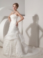 We love sheath style dresses. There's something about their classic elegance that other dresses cannot recreate. This one features a strapless bodice with straight neckline and a lovely wrapped texture. The dress is made from gorgeous lace in the top and the bottom area, which hugs your slim figure perfectly. The skirt is made from several layers of ruffled fabric that culminate in lovely train with pick ups in the back. Timeless!