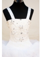 This beautiful White pageant dress features a straight neckline on an A-line silhouette accented with an embellished bust, and tiered skirt with multi layers of soft tulle with a ruffled hem.