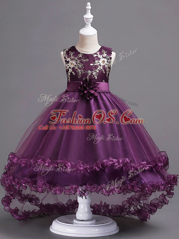 Beautiful Appliques and Hand Made Flower Little Girls Pageant Gowns Dark Purple Zipper Sleeveless High Low