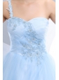 You'll look and feel like a princess in this stunning one shoulder ball gown for prom. Sweetheart bodice and lace up design add sexuality and elegance to this light blue prom gown. Embroidered accents add a touch of nature and the layered floor length skirt adds to the drama. Do you want to be the princess on your next event? Take it home now and complish your dream.