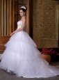 Do you want to rock the presents in your wedding? If so, that dress will be your best choice. The wedding dress features a strapless bodice encrusted by the embroidery and beading throughout. The sharp shape design of the embroidery will definitely flatter your figure. For the skirt, made of tieres of ruffles, adds more romance to the dress. The tulle fabric will make you walk freely. The chapel train gives you a touch of elegance to the dress. A hidden zipper up back finishes the perfect design.