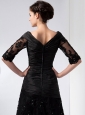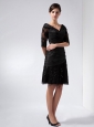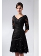 If you are looking for something simple but special for your party, here is the one you can choose. This beautiful style features a V-neck neckline with the whole bodice ruched to create a fantastic view. The ruched straps on the shoulder extends to widen your shoulder and the black lace half-length sleeves cause an illusion of mistery. Appliques and sequins decorate the lace sleeves and the A-line skirt, adding the dress a sense of loveliness and elegance. The hidden zipper on the ruched back allows easy off and on. A wonderful dress for you!