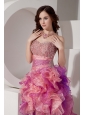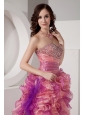 If you ever wanted to wear a rainbow, this dress could be as close as you'll come! It features a heavily beaded bodice with a pretty sweetheart neckline. A ruching waist with beading sparsely scattered and a striking broach adorn the mid-section of the dress, leading up to the focal point. The focal point is, no doubt, the fabulous high-low skirt. It's made from yards and yards of multicolored tulle that create a fantastic rainbow effect. The eye-catching train gently touches the floor giving a sens of luxury.