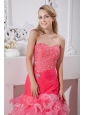 Show off your soft feminine side in this stunning beaded long formal dress. An elegant long dress for prom or formals featuring a slim fitting bodice with a sweetheart neckline and beaded accents sparkling throughout. A plethora of ruffles creates a unique look on the high-low mermaid skirt. Ruched style on the under waist part tightens the body very well. A hidden zipper makes for easy off and on and secures the dress in place.