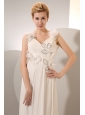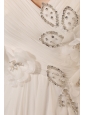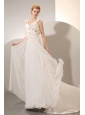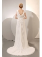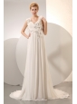 Silhouette: Empire Neckline: V-neck Waist: Fitted Hemline/Train: Court Train Sleeve Length: Sleeveless Embellishment: Beading and Ruch Back Detail: Zipper-up Fully Lined: Yes Built-In Bra: Yes Fabric: Chiffon Shown Color: White(Color & Style representation may vary by monitor.) Wedding Venues: Garden, Beach, Outdoor, Church, Hall Season: Spring, Summer, Fall, Winter