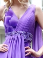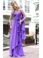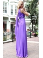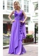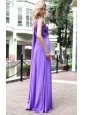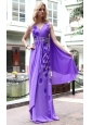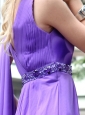 Elegant is one word that comes to mind when you look at this gorgeous purple prom. It features wide straps, a V-like neckline and lovely beaded waistband embellished in the midsection. Under the band, the midsection of the dress is gathered, which adds lots of visual interest to the design. The back of the dress features an asymmetrical design as well as a hanging sash sewn onto one ruched strap. The floor-length skirt extends from the pleat in the midsection in smooth, clean lines while enveloping your legs in beautiful fabric. The floral pint fabric on the side and the bust creating a flirty feel. Such a beautiful gown for any dressy occasion.