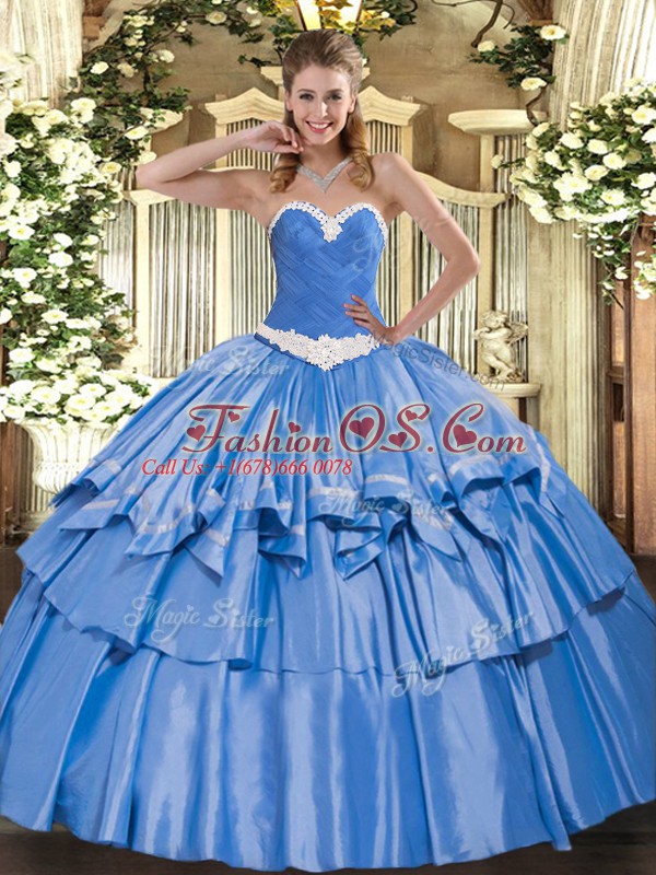 Beautiful Floor Length Lace Up Vestidos de Quinceanera Blue for Military Ball and Sweet 16 and Quinceanera with Appliques and Ruffled Layers