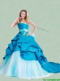 Beautiful Handcrafted Flowers and Ruffled Strapless Quinceanera Dress with Brush Train