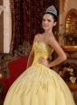 This amazing yellow quinceanera dress will have you feeling and looking like royalty. It features a one strap bodice that's embellished with pleats.The puffy skirt is long and flowing and pools in a lovely puddle at your feet. The simple, yet intricate designs in this gown will surely make it a favorite.