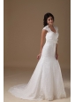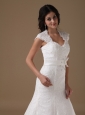 Gorgeous and magnificent! This lovely wedding dress is accented with the embroidered lace throughout the dress, and the bodice features two wide straps with V-neckline which gives a sexy look, the wide belt accents the waist part is trimed with clear beading and a chic hand made flower. The floor-length skirt to create a beautiful sweep train. A zipper up back completes this fabulous dress. Full of modern flavor and pageantry.