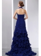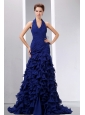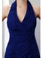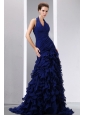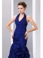Home >  Prom Dresses >  Beautiful Prom Dresses > Beautiful Navy Blue Mermaid Halter Prom Dress Court Train Chiffon Ruch and Ruffles