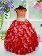 Beautiful Off The Shoulder Sleeveless Child Pageant Dress High Low Beading and Hand Made Flower Red Organza