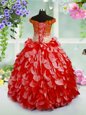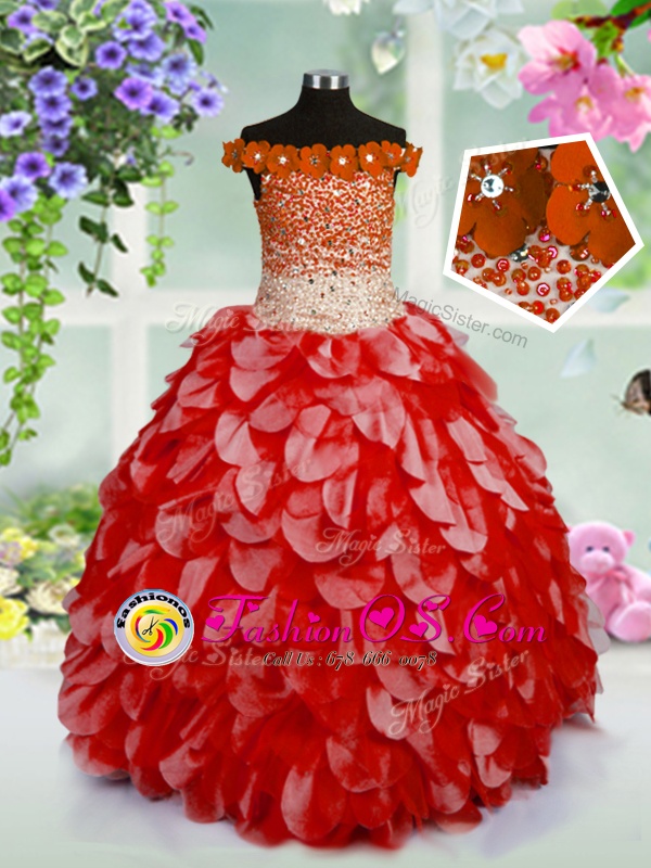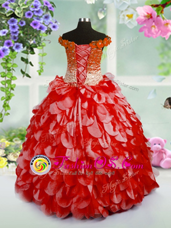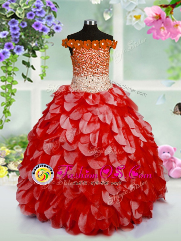 Home >  Special Occasion Dresses >  New Style Little Girl Pageant Dresses > Beautiful Off The Shoulder Sleeveless Child Pageant Dress High Low Beading and Hand Made Flower Red Organza