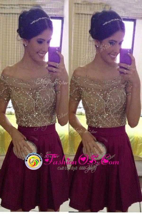 Home >  Special Occasion Dresses >  Cocktail Dresses > Beautiful Off the Shoulder Sleeveless Mini Length Beading Zipper Cocktail Dresses with Burgundy