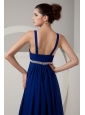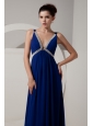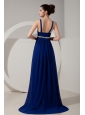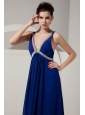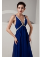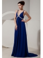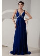 Beautiful Peacock Blue V-neck Prom Dress Empire Brush Train Chiffon Beading