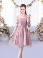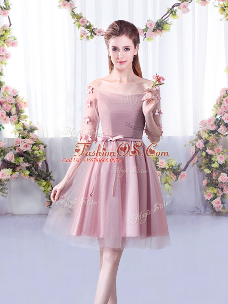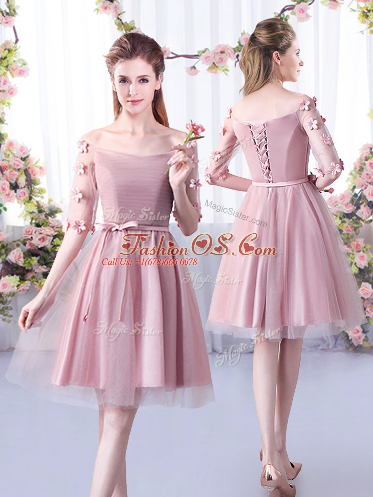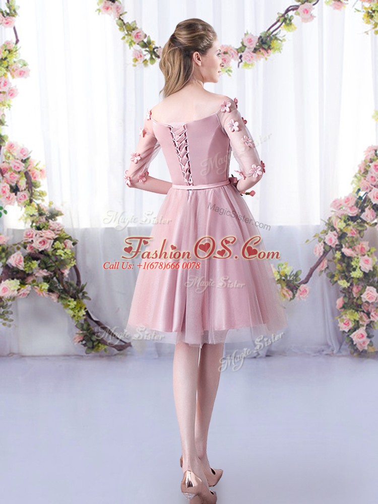 Beautiful Pink Tulle Lace Up Vestidos de Damas Half Sleeves Knee Length Belt
