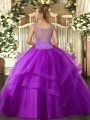 Beautiful Purple Ball Gowns Beading and Ruffles Vestidos de Quinceanera Clasp Handle Tulle Sleeveless Floor Length