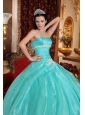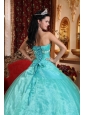 This teal strapless floor length quinceanera dress features a ruched bodice with applique over the bust line to accent the beaty of the top part.The white appliques on the waistline add this already gorgeous ball gown more points.The full length skirt falls from the body-hugging waist in tiers with a bustle effect.You'll absolutely love this flirty strapless sweetheart ball gown with romantic ruffles and applique.