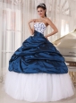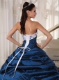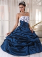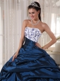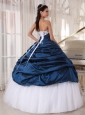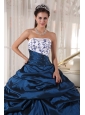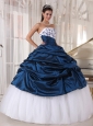 The blue and white strapless floor length quinceanera dress is your perfect choice to attend any occasion.The fitted bodice is adorned with embellished appliques,scattered beadwork and also gorgeous ruchings.While the bouffant skirt in contrasting colors make the dress so gorgeous. A lace up back completes this fabulous design.