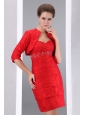 This chic and elegant red formal evening dress is sure to be a favorite in your closet. A sophisticated, short gown featuring one of a kind floral fabri,a sweetheart neckline, and a modest knee length.The intricately handcrafted embroidery encrusts the empire waist.The column skirt stands out for the tiered overlays.A stylish matching jacket gives this gown a glamorous design from any direction.
