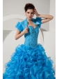 An elegant and gorgeous gown accents a sweetheart neckline and a fully beaded bodice. The beads on the bodice create a shinning and delicate look. It is a ruffled ball skirt, the layered ruffles make the dress full and sassy. A lace up back hugs you body tightly to present your feminine pretty. The matching jacket with ruffled cap sleeves also adds beauty to the dress. A charm, beautiful dress entirely displayes the elegant and poised temperature.