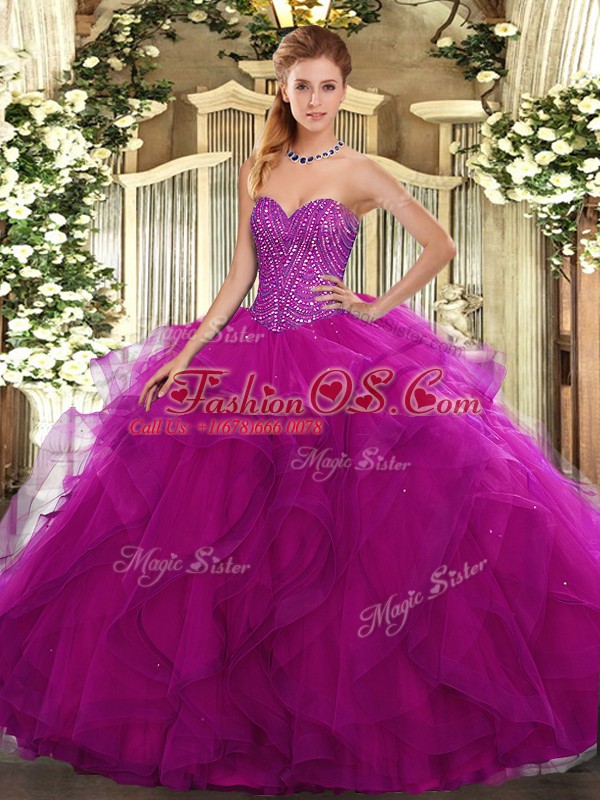 Beautiful Sleeveless Floor Length Beading and Ruffles Lace Up Vestidos de Quinceanera with Fuchsia