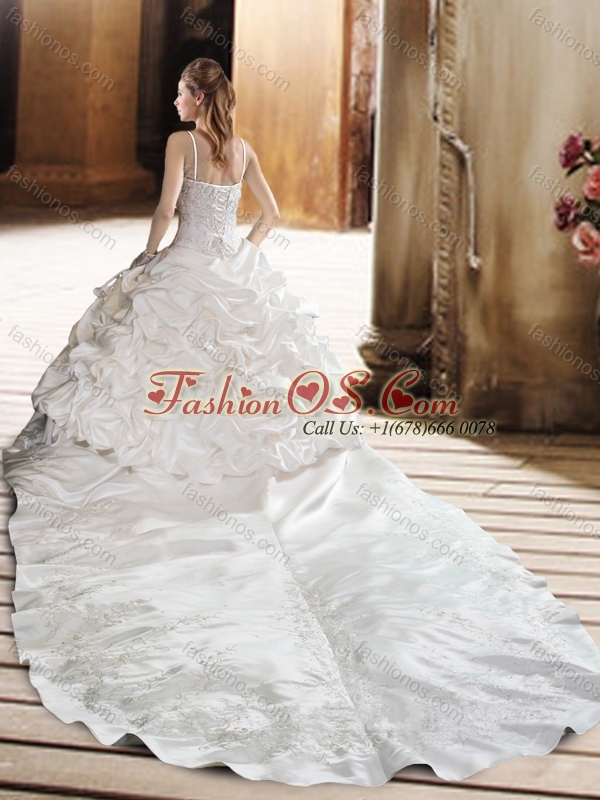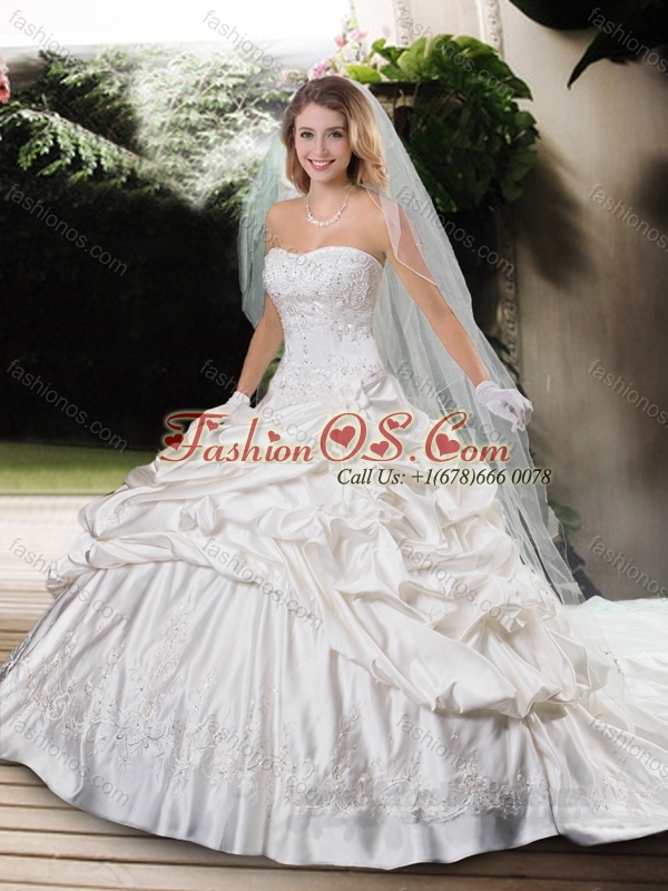 Beautiful Strapless Beading Chapel Train Wedding Dresses with Appliques