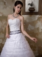 A wedding dress that gives a dimensional look! This unique sweetheart neckline dress is styled with the tightly gathered skirt with the layered design on the bottom of the dress, which is trendy and attractive. And the appliques cover the top beautifully. What can not be forgotten is the silvery grey sash that is a perfect finish.