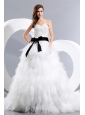 This dress must be a great choice!This stunning strapless gown has a sweetheart neckline and ornate beaded applique through the bust and bodice.The waistband with a bow flirt the waist.The floor lenghth skirt has an asymmetrical hem and is made from many layers of ruched tulle. The ruching adds just enough fullness without creating a lot of bulk. Zipper up back adds charm to the dress.