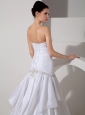 Classic silhouette with contemporary construction, this exquisite wedding Gown is the definition of wow. Taffeta white gown features ruffled skirt tiers and lace-up back. The fitted bodice is adorned with sweetheart neckline and flattering ruches all throughout the body part and the ruches create a cross over look. Beaded appliques are carefully placed for a body slimming effect while corset back ensures a perfect fit. Skirt drama provides a fashion forward look while still maintaining the princess feel you would expect.