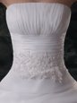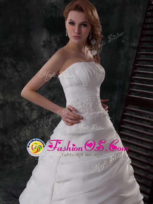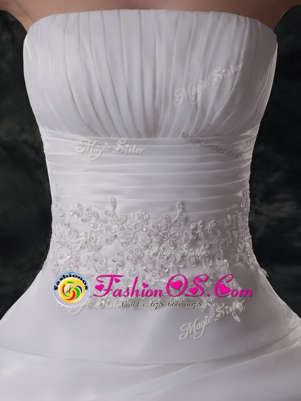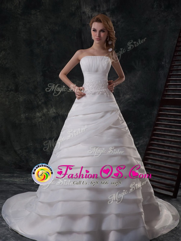 Beautiful White Wedding Gown Wedding Party and For with Beading and Appliques and Ruffled Layers Strapless Sleeveless Brush Train Lace Up