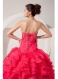 Beauty Coral Red A-line / Princess Sweetheart Sweet 16 Dress Brush Train Taffeta Beading