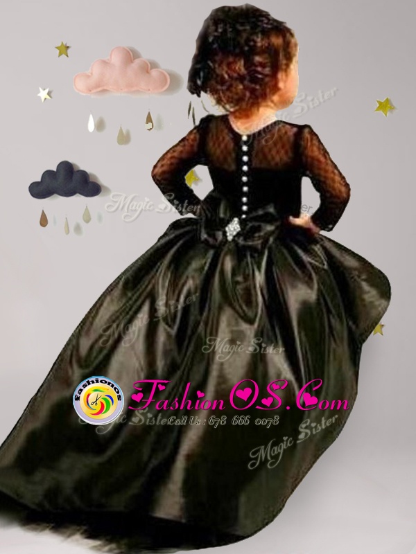 Best Black Ball Gowns Taffeta and Tulle Scoop Long Sleeves Bowknot With Train Clasp Handle Toddler Flower Girl Dress Brush Train