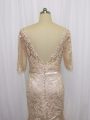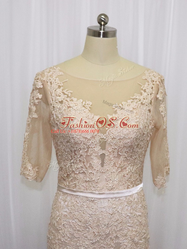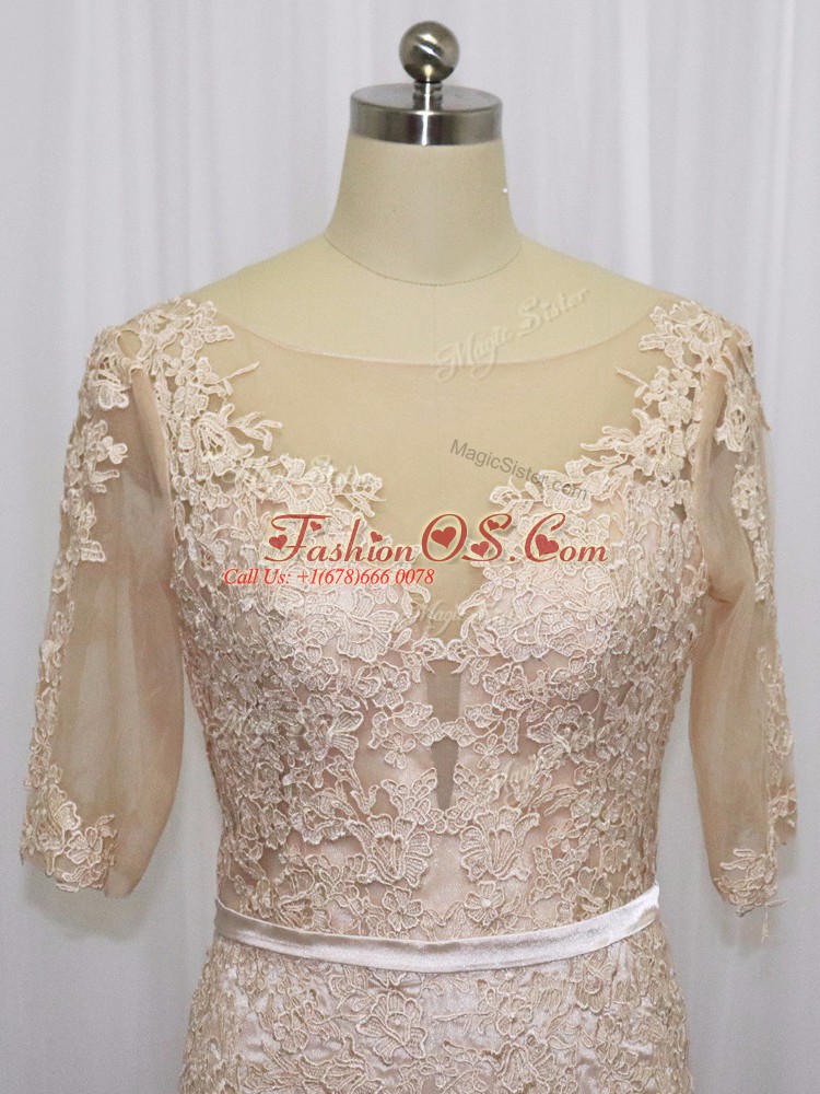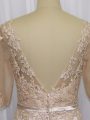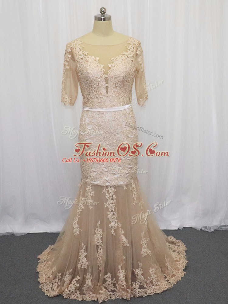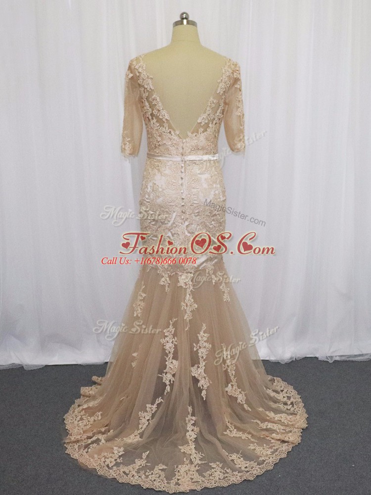 Best Champagne Half Sleeves Tulle Brush Train Backless Evening Dress for Prom and Party and Military Ball