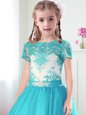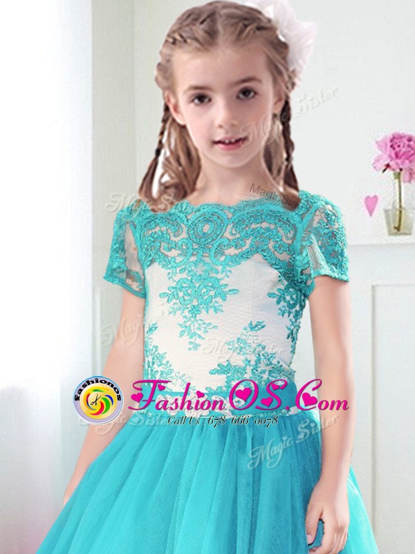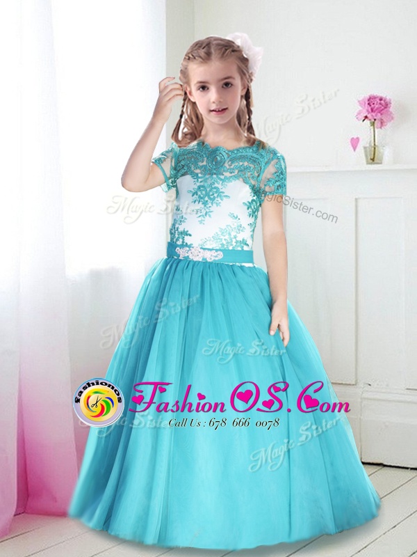 Best Floor Length Turquoise Flower Girl Dresses Scoop Short Sleeves Zipper